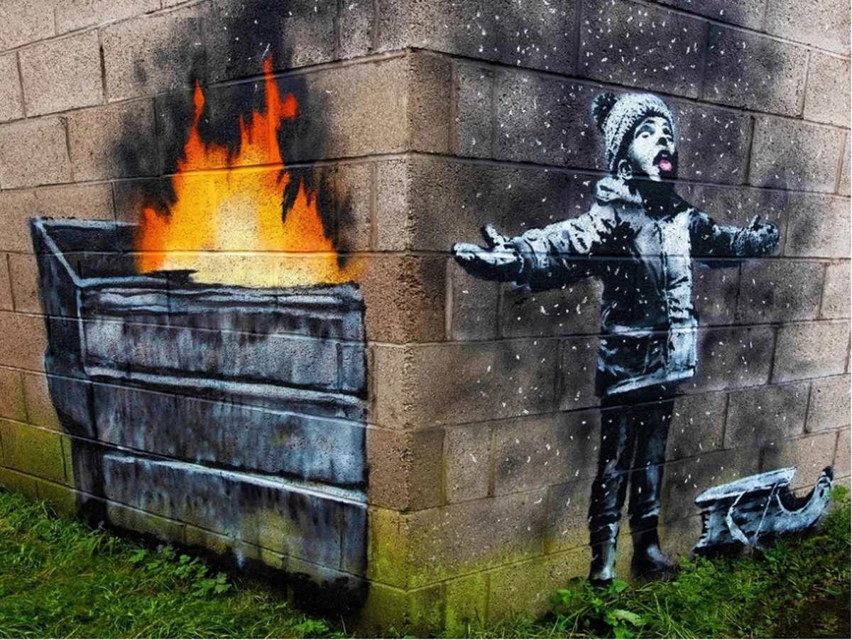 There is a dark sense of humor on display in Seasonโs Greetings, which appeared on a concrete garage wall in Port Talbot mere days before Christmas in 2019. From one side of the building, the image appears to show a child innocently catching snowflakes falling from the sky on his tongue, but when viewers turn the corner, they realize that what looks like snow is actually ash from dumpster fire. Port Talbot is home to the largest steel plant in the UK, and its residents inhale some of the most polluted air in the country.