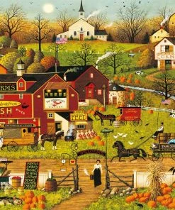 Here at Mill Creek, you will encounter the traditional life and town within the New England area. Apples sold at the side of the street, chicken feed is available and horse and buggies trot through the dirt roads. ย This 300-large piece jigsaw puzzle, Blackbirds Roost at Mill Creek, is by artist Charles Wysocki.ย