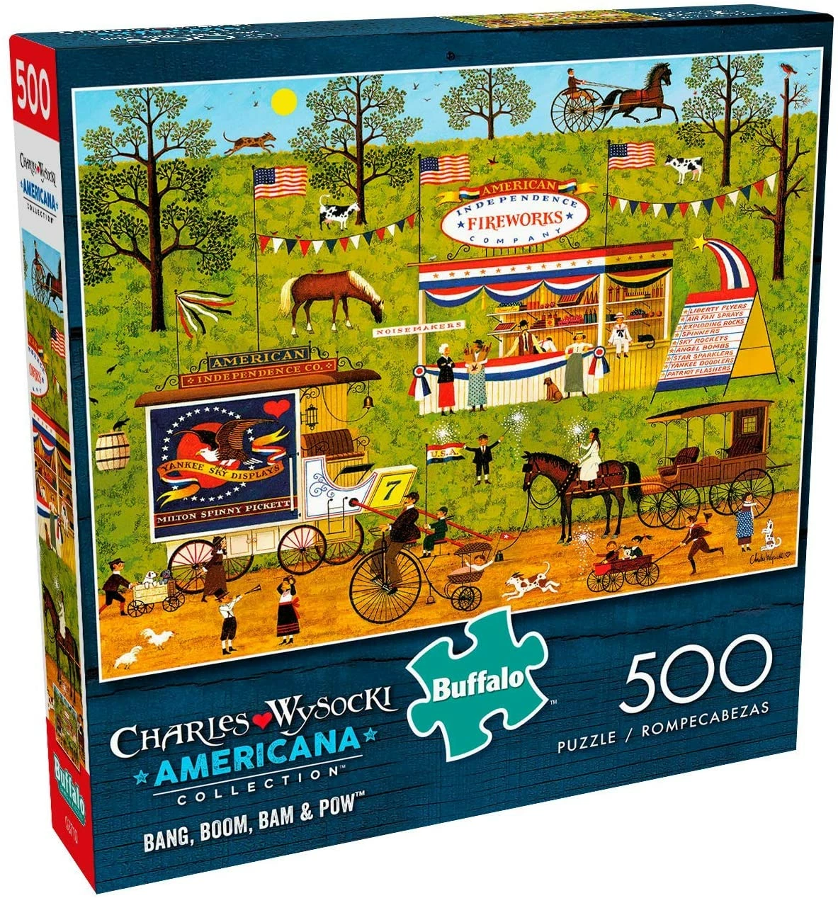 In this 500-piece puzzle, Bang, Boom, Bam & Pow, witness the American Independence Fireworks Company and all the excited town goers ready to enjoy all the fireworks up for grabs. Based on the artwork of Charles Wysocki, this puzzle is a part of the Americana Collection by Buffalo Games.