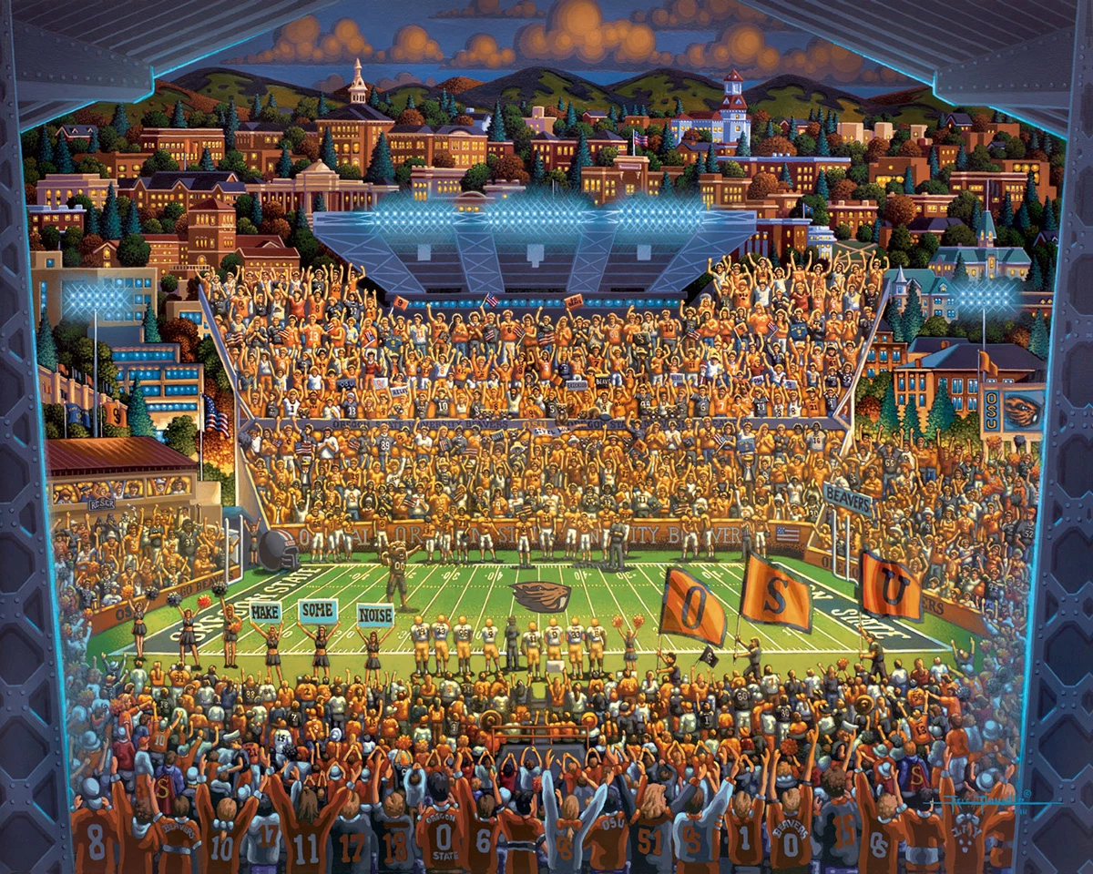 Set against the green backdrop of Corvallis, Oregon, Eric has captured all of the excitement and energy of an Oregon State Beavers football game. It’s newly redesign branding and mascot, Benny the Beaver can be seen throughout the artwork. Known for many conference championships and as well as producing many great NFL players throughout the year, Oregon State Football has a great reputation as a successful football team.