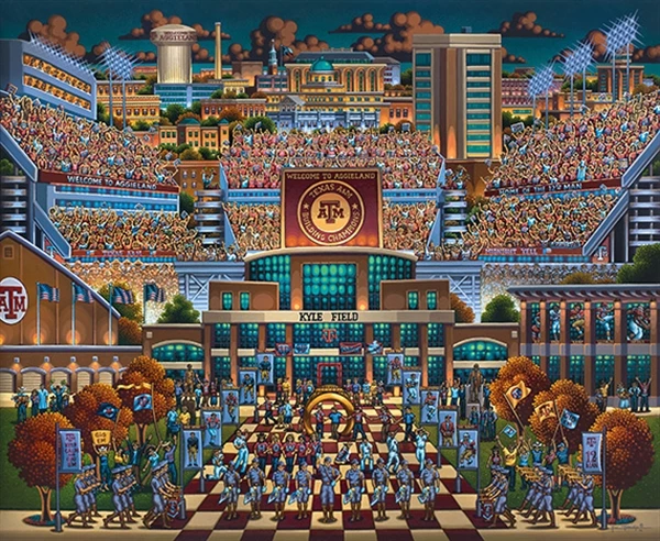 Welcome to Aggieland! Eric has embodied the pride and enthusiasm of Texas collegiate football in this dynamic painting of Kyle Field, home of the Texas A&M Aggies. Traditions run deep at this university and definitely make attending an Aggie game different than anything you have ever experienced. Set at dusk, the energy abounds in this painting as buildings come aglow and the fans go wild in support of their team.