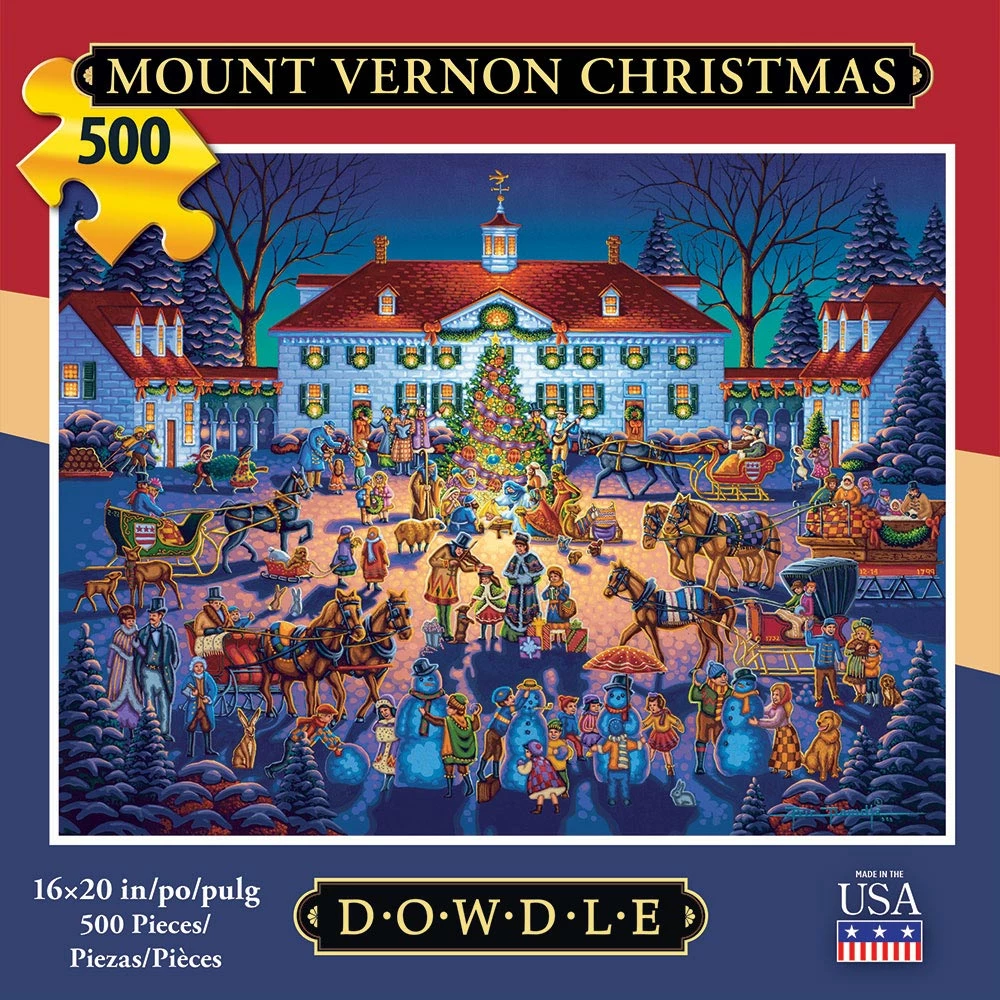In the 500 piece jigsaw puzzle, Mount Vernon Christmas by Dowdle Folk Art, an illustration of Mount Vernon during Christmas time is depicted, people gathered around the Christmas tree in the middle of town. The artist, Eric Dowdle, made this illustration colorful, detailed, and festive. This puzzle has dimensions of 20″ x 16″ which makes this a fun and challenging activity to do with the entire familyโespecially if you want to get into the Christmas spirit!