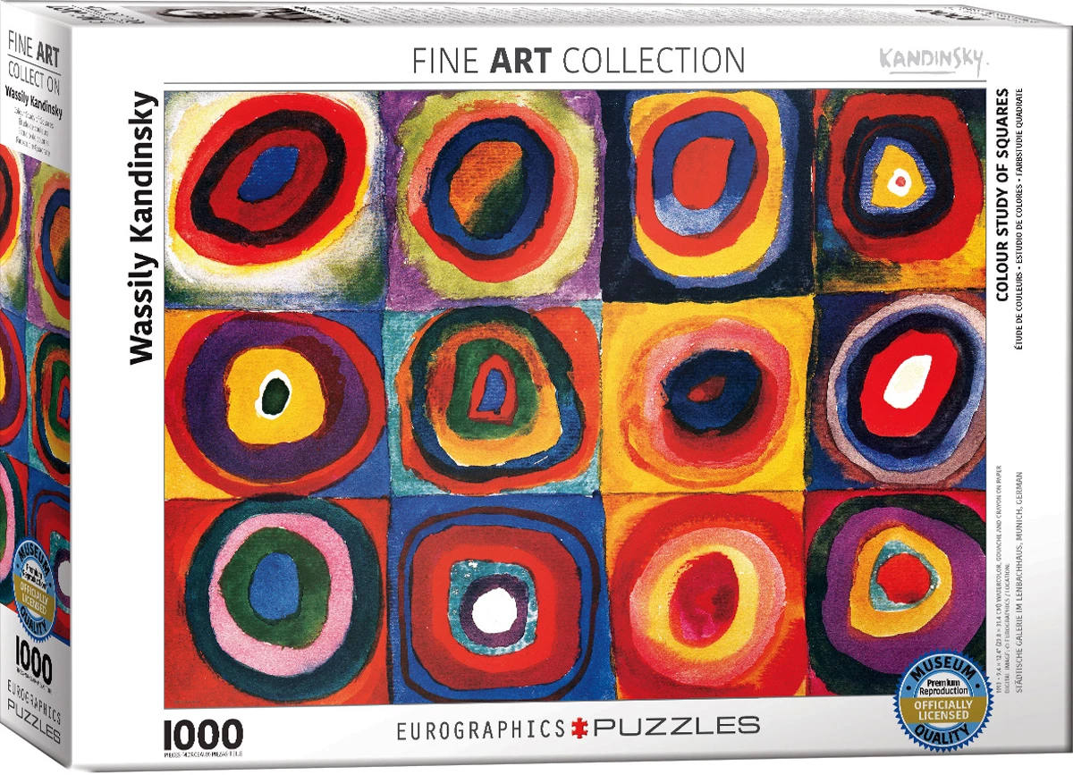 1000 piece puzzle. Color Study of Squares. Wassily Kandinsky is credited with painting the first modern abstract works. This Superior quality puzzle will delight and educate all at the same time. Strong high – quality, easy fit puzzle pieces that won’t break. Made from non – toxic recycled board.