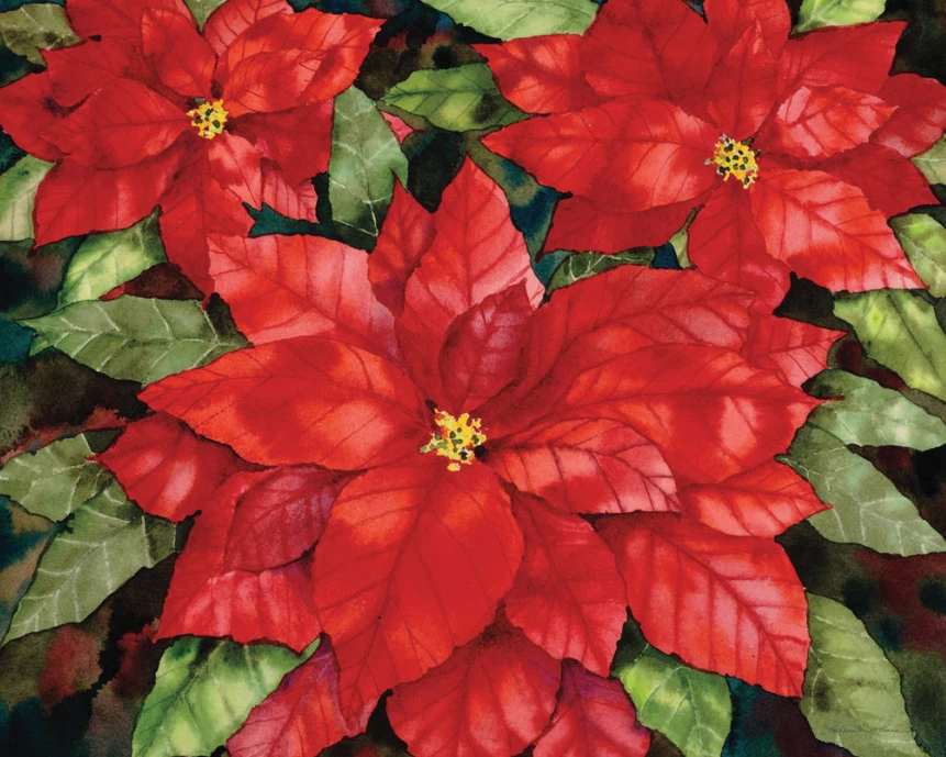 Poinsettia’s association with Christmas began in 16th-century Mexico, where legend tells of a girl, commonly called Pepita, who was too poor to provide a gift for the celebration of Jesus’ birthday, was inspired by an angel to gather weeds from the roadside and place them in front of the church altar. Crimson blossoms sprouted from the weeds and became poinsettias. The star-shaped leaf pattern is said to symbolize the Star of Bethlehem and the red color represents the blood sacrifice of Jesus’s crucifixion. Enjoy the Christmas flower in this 24βx 30β 1000 piece puzzle. By Kathleen Parr McKenna