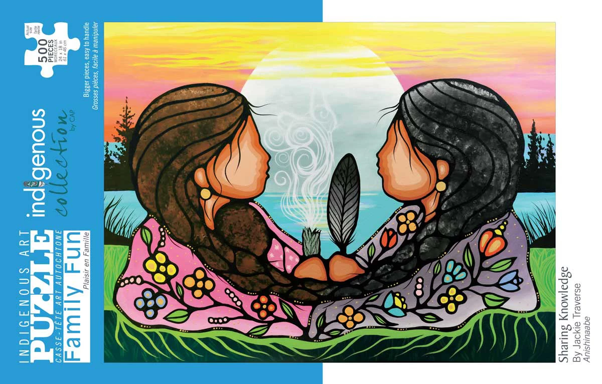 Sharing Knowledge by Jackie Traverse – 500 Piece Puzzle from Indigenous Art Puzzles. Artist’s are paid a royalty on every sale.