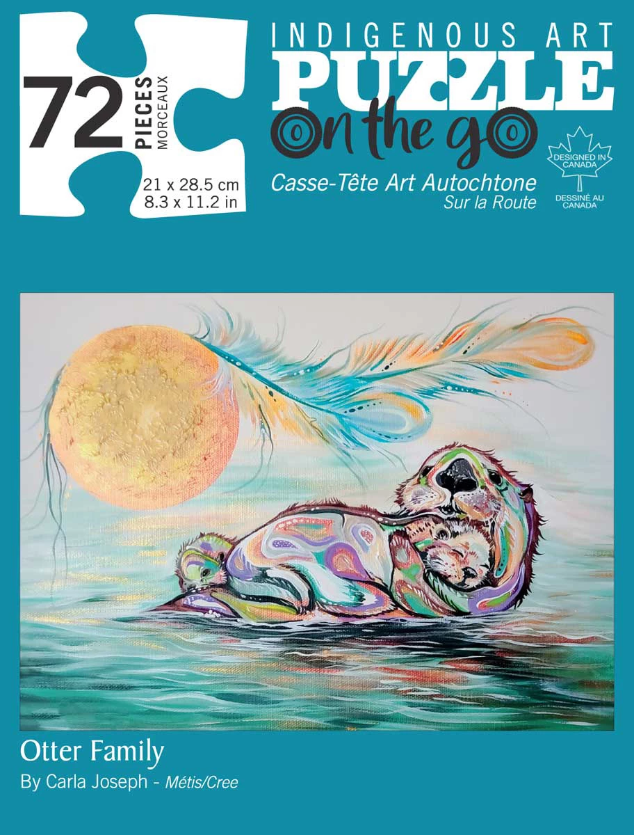 Otter Family Mini by Carla Joseph – 72 Piece Mini Puzzle from Indigenous Art Puzzles. Puzzle comes in a unique easy to carry tin package! Artist’s are paid a royalty on every sale.