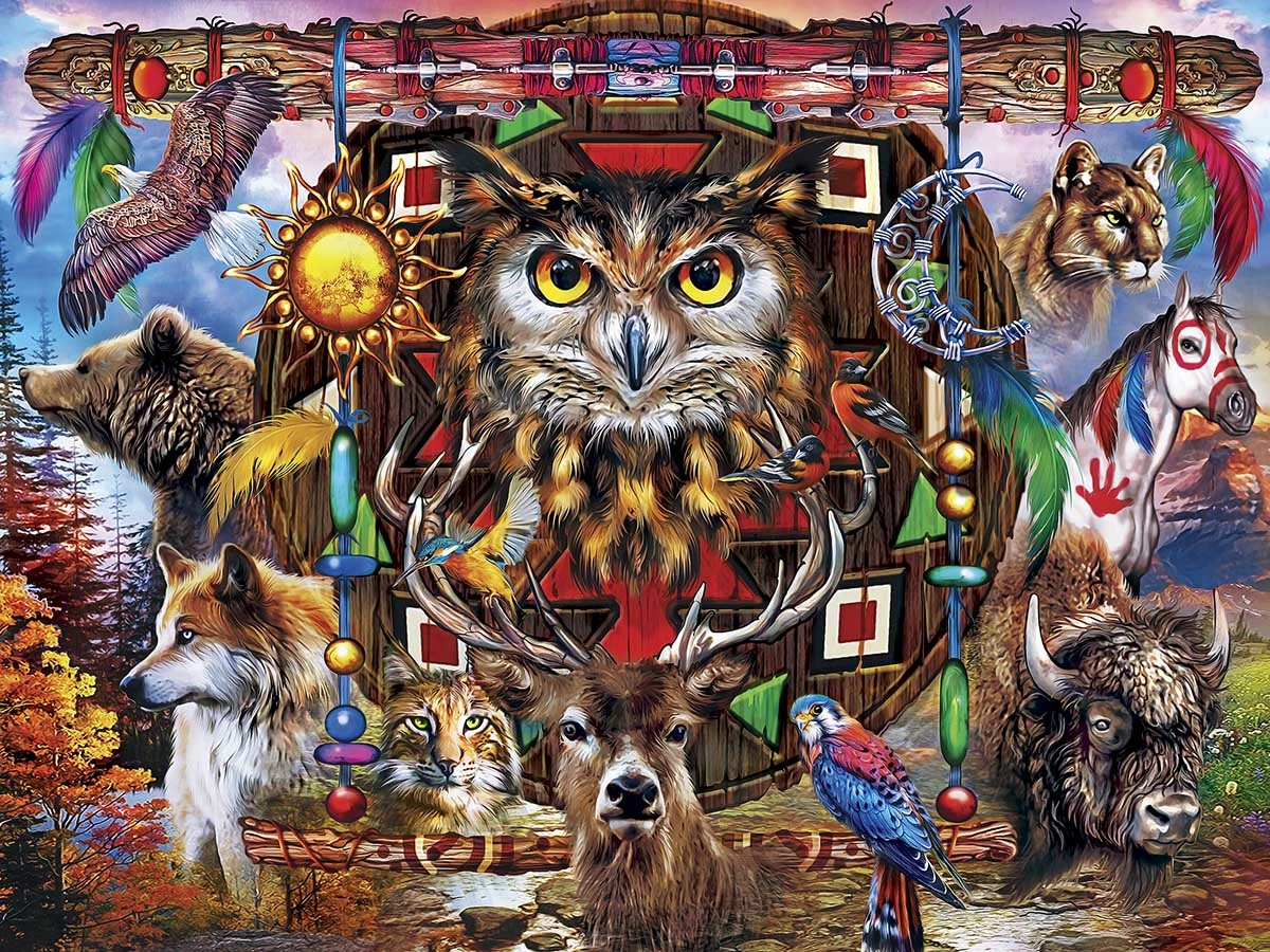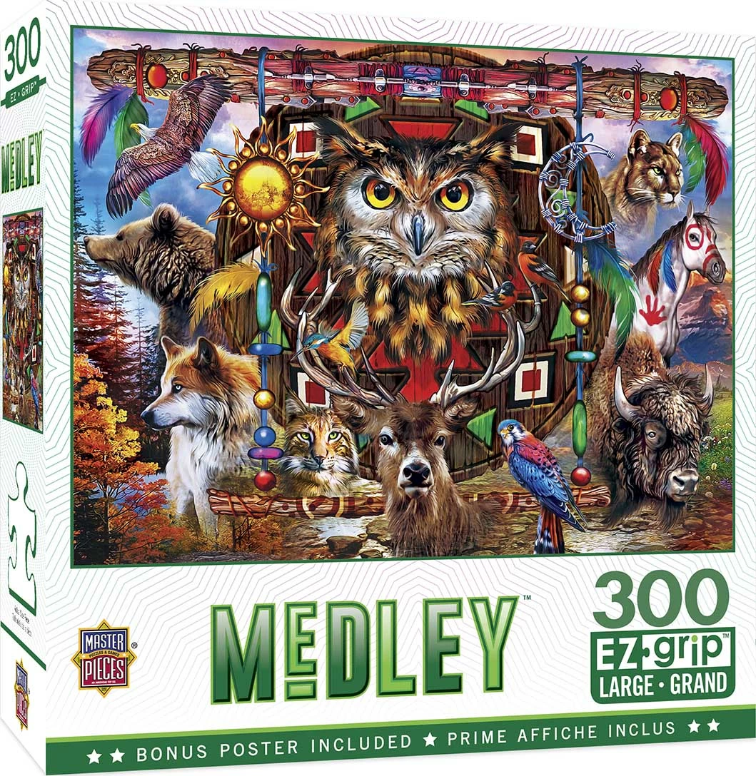 In this 300 piece jigsaw puzzle from Masterpieces, solemn animals are surrounded by spiritualistic imagery and totems, perhaps one of them is your spirit guide? ย This puzzle has larger than average pieces, perfect for young avid puzzle fans!