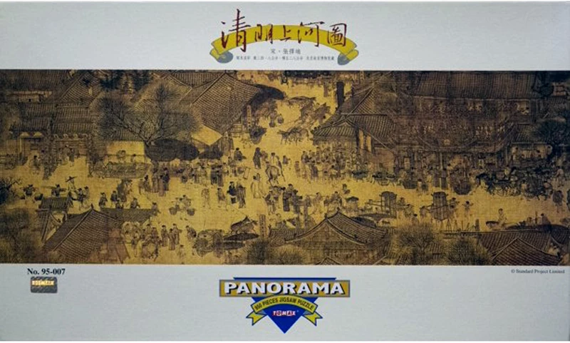 Quingming Shanghe Tu – 950 piece panoramic jigsaw puzzle from Tomax. Finished puzzle dimensions: 13.5 x 40. Released 2013. Qingming Shanghe Tu (Along the River During the Qingming Festival) is panoramic painting originally crafted by Song Dynasty artist Zhang Zeduan. Today the topic has many variations from other dynasties and the artwork has been translated into jigsaw puzzles like this one.