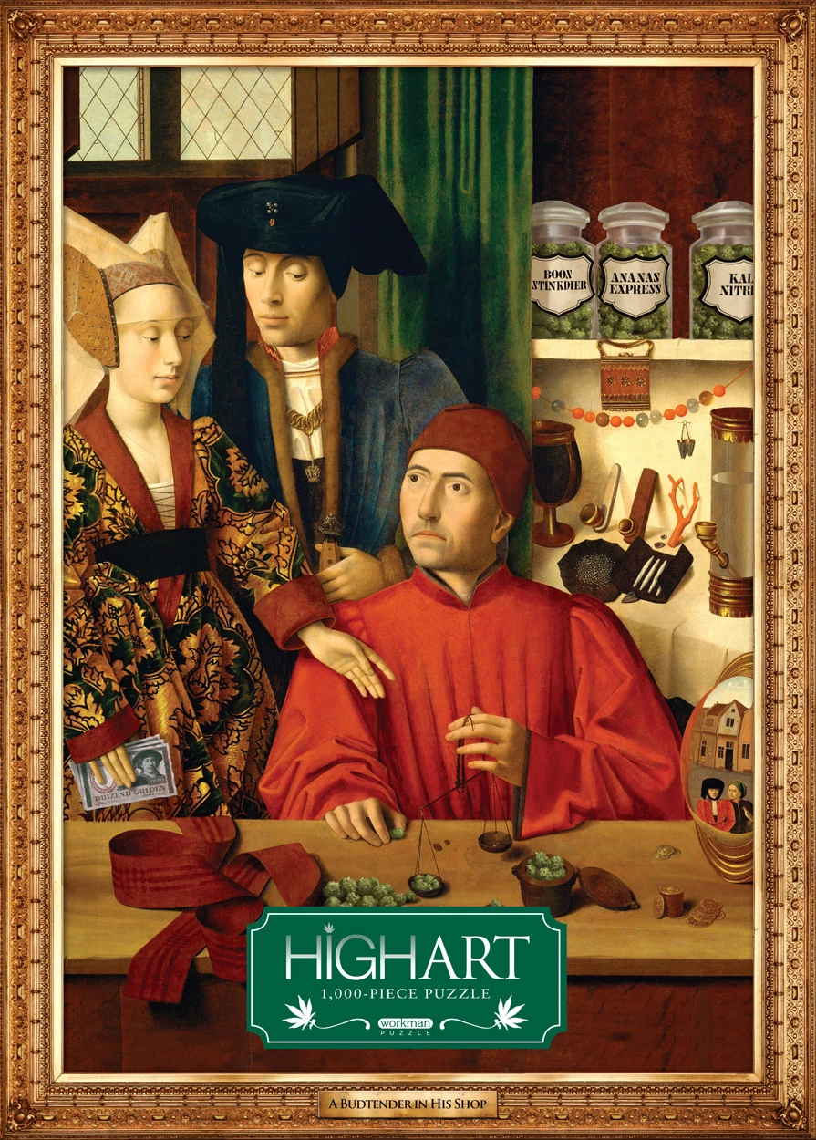 ย A hilarious, cannabis-fueled parody of fine art in a 1,000-piece jigsaw puzzle. High Art reimagines priceless masterpieces as if the artists and their subjects loved their weed (and who knows, maybe they did)โโrecasting The Goldsmith in His Shop as a dispensary, while staying faithful to the luminous attention to detail typical of Northern Renaissance painting. Just look at those buds and paraphernalia! Dive right in, and enjoy the attention-absorbing and time-forgetting pleasures that a jigsaw puzzle offers, no matter what your state of mindโฆย